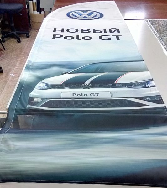Изготовление флагов на выносных уличных конструкциях оптимально на флажной сетке. Однако для тех, кто хочет «читаемость» с двух сторон, предлагаем блэкаут.